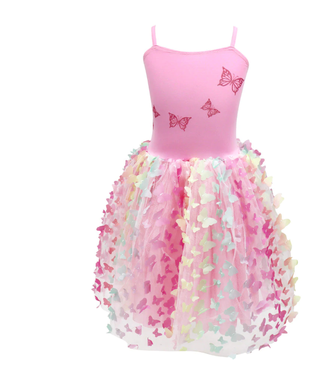 Make her day magical with this Rainbow Butterfly Party Dress by Pink Poppy. A voluminous multi layered skirt features a soft tulle, beautifully embroidered with 3D Ombre Rainbow Butterflies and a soft silky lining. Glittering pink butterflies feature on the comfortable stretch, jersey bodice with adjustable shoulder straps for the perfect fit. It is a unique, eye-catching dress suitable for parties, dressing up, playtime, special occasions or as a special gift.