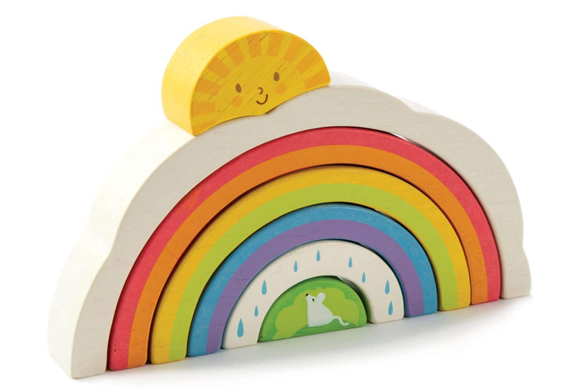 COMPLETE PLAY SET – The skill-building product comes as a package that weighs 0.77 lbs and measures 8.27 x 1.18 x 5.24 inches. After purchase, you’ll find seven pieces of wooden rainbow tunnels and the smiling sun.